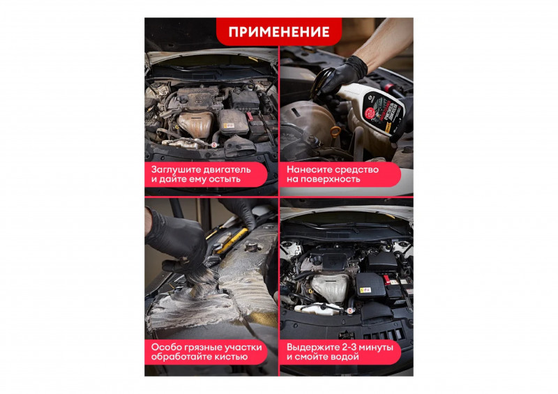 Чистящее средство. Произведено на основе эффективных моющих компонентов и активных добавок. Предназначено для наружной очистки подкапотного пространства (двигателя и его частей) от масляных пятен, подтеков смазки, налипшей пыли и других загрязнений. Мощная щелочная формула позволяет очистить даже самые застарелые загрязнения.