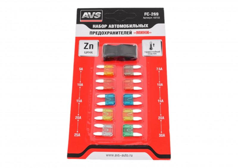 Наборы AVS FC-269 позволят Вам без проблем заменить сгоревший предохранитель в автомобиле. Корпус изделия выполнен из прозрачного пластика, а элемент — из цинкового сплава. Применяются на иномарках.