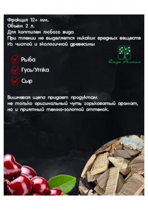 Для получения различных вкусовых оттенков вишневую щепу можно смело добавлять к дубовой, ольховой или буковой щепе из расчета 1 часть вишни на 4 части бука/ольхи/дуба. Щепа вишни придаст блюдам свой оригинальный аромат и чуть-чуть оттенит вкус, который дарит копченостям щепа неплодовых деревьев