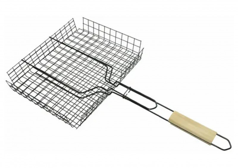 рукоятка оснащена деревянной вставкой и фиксирующей скобой, которая зажимает створки решётки.