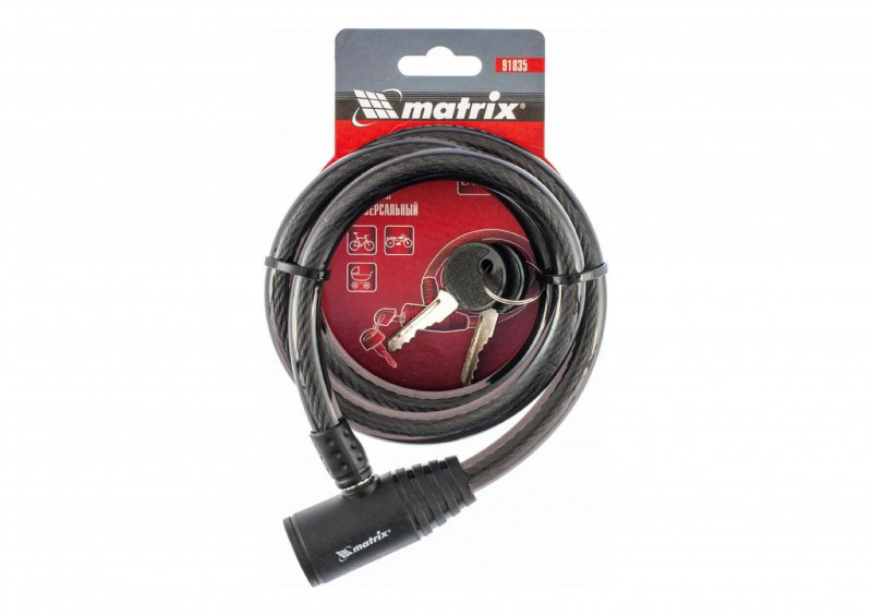 Тросовый универсальный замок 10х650мм MATRIX имеет широкий спектр применения: защита велосипедов, мототехники, детских колясок и санок, запирания хозяйственных и подсобных помещений и пр. Стальной трос имеет гибкую конструкцию, оснащен пластиковой оболочкой.